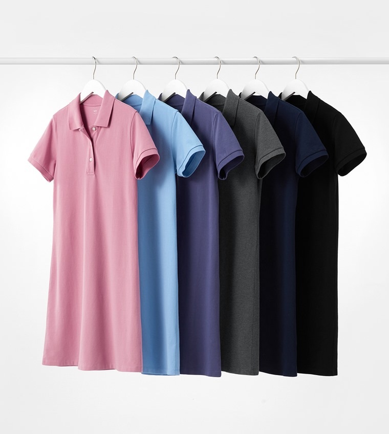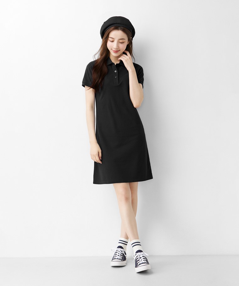 棉質網眼彈性polo洋裝-女(黑色-S)