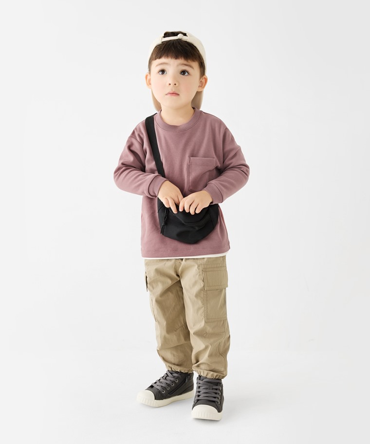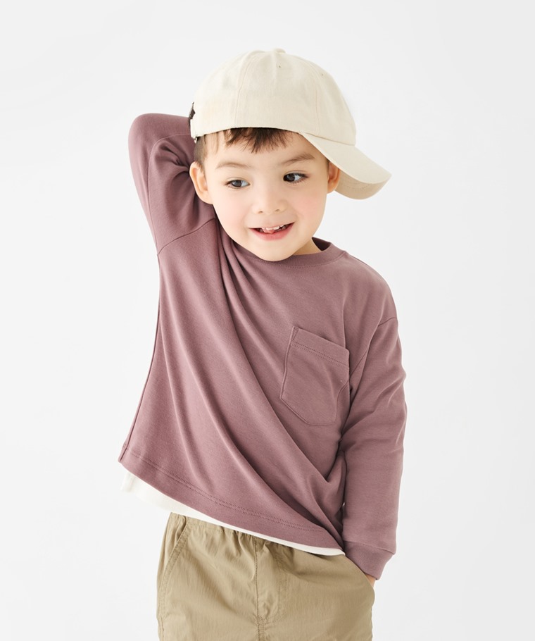 磨毛柔棉口袋圓領長袖T恤-童(深灰粉-110)