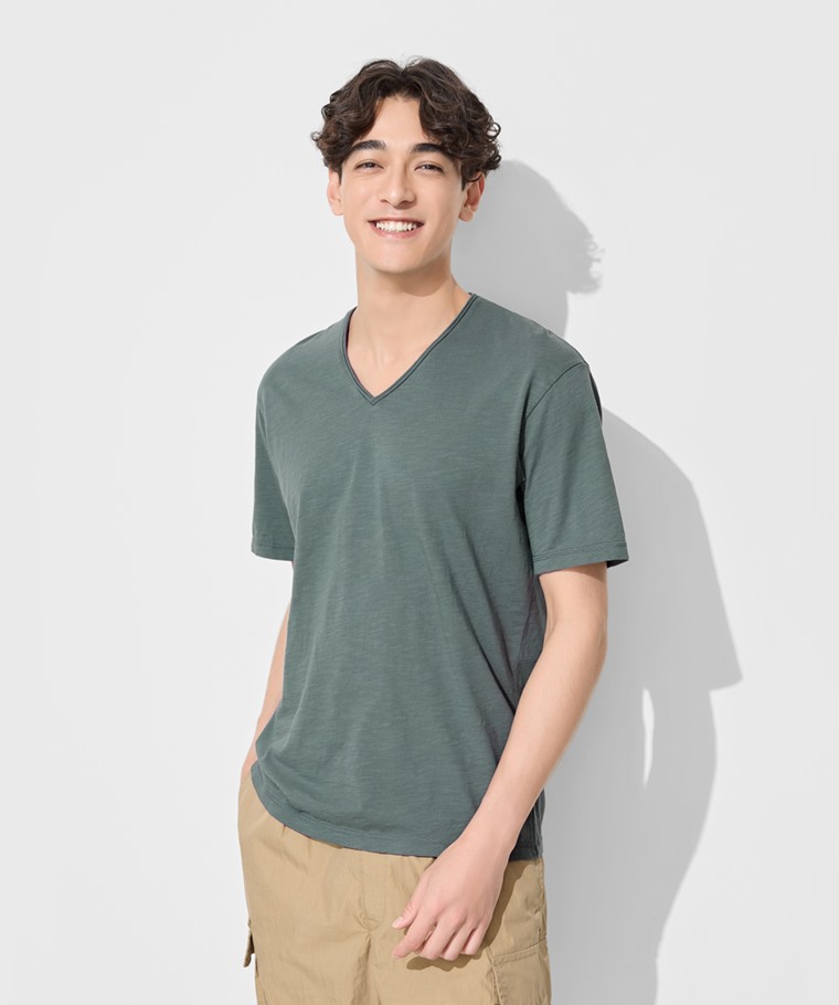 竹節棉V領T恤-男(灰卡其-S)