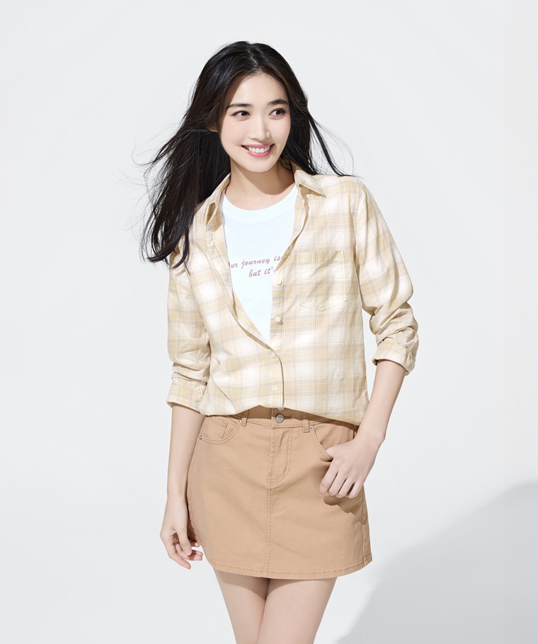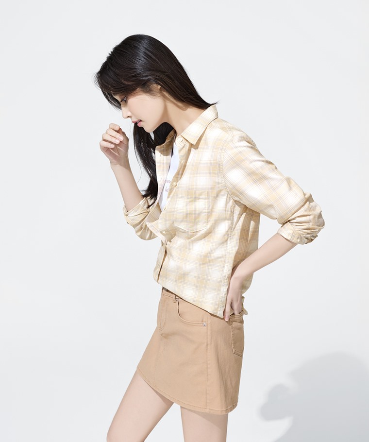 輕薄格紋長袖襯衫-女(粉綠格-S)