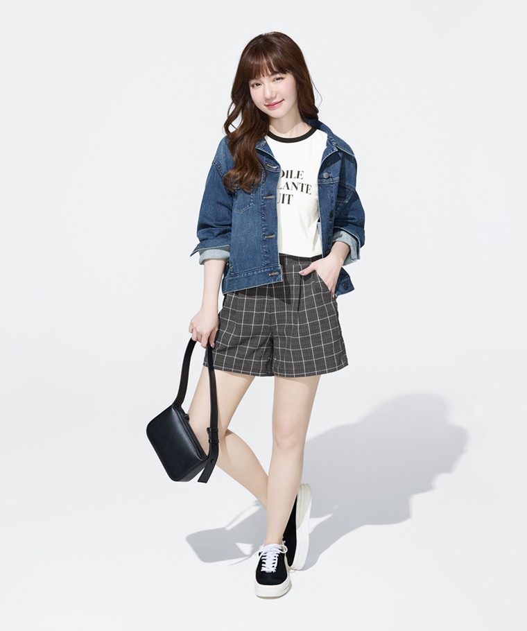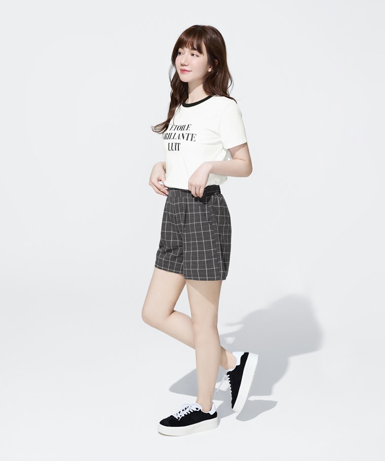 彈力格紋打褶短褲-女(黑白細格-S)