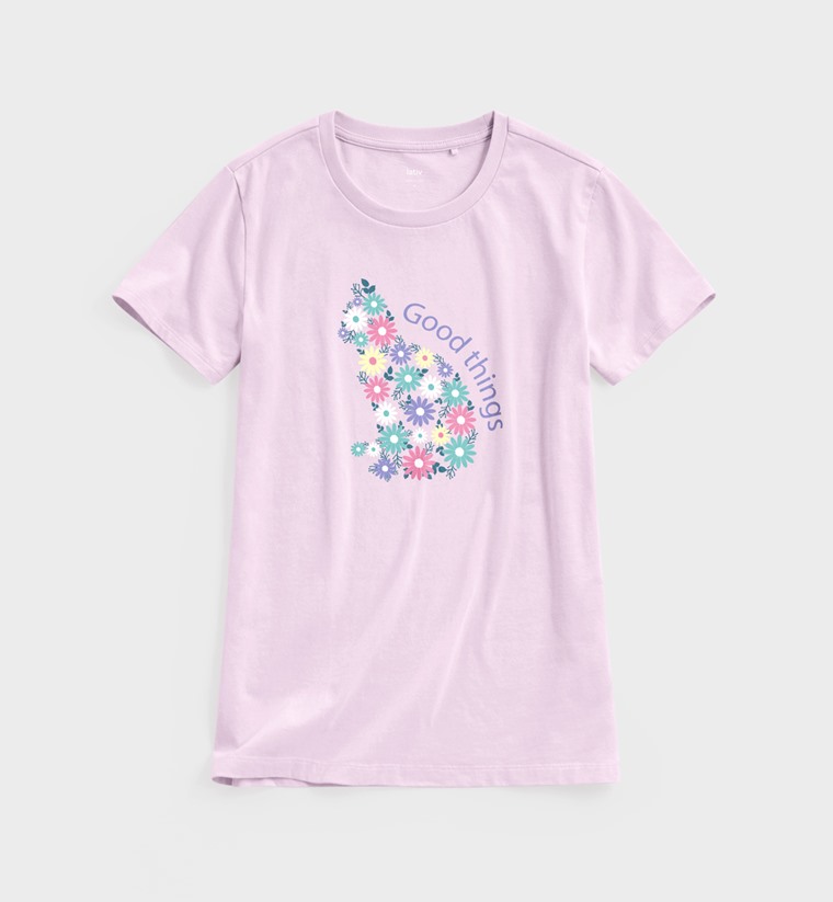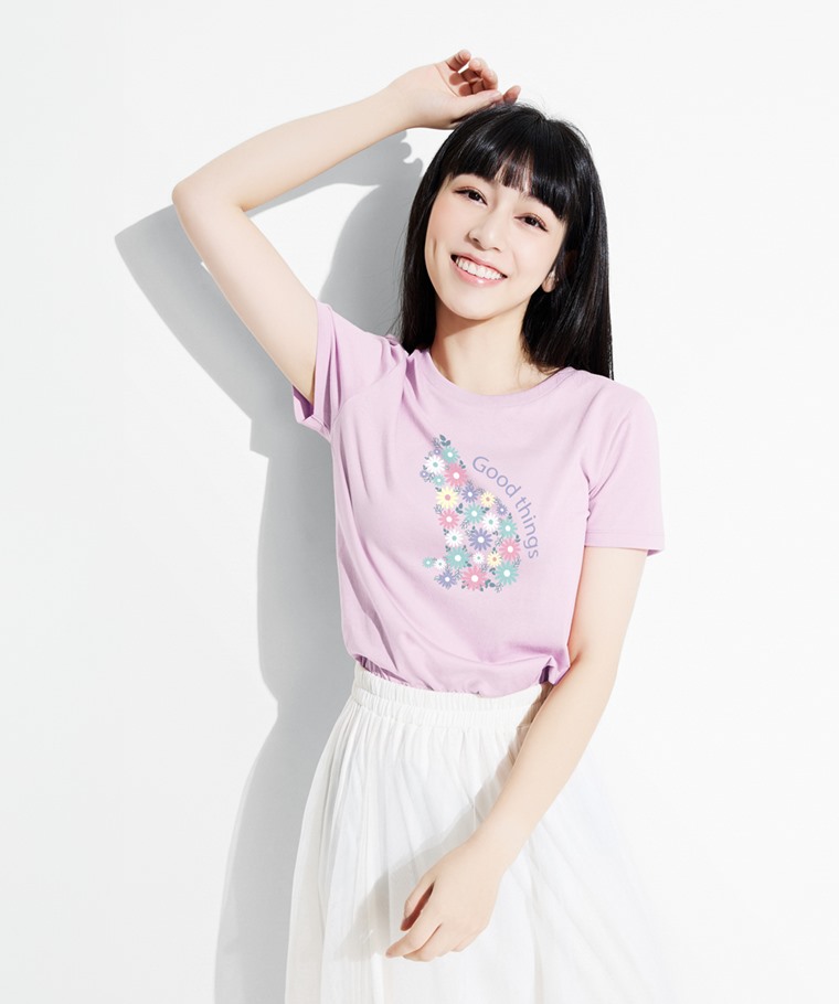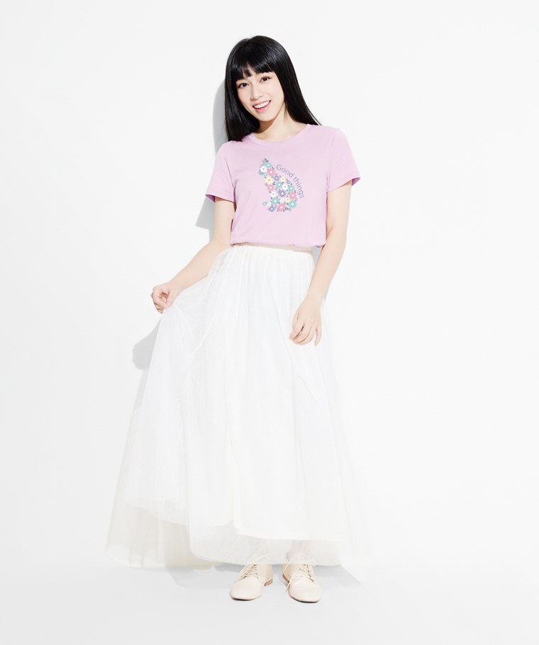 貓咪花卉印花T恤-女(粉紫-M)