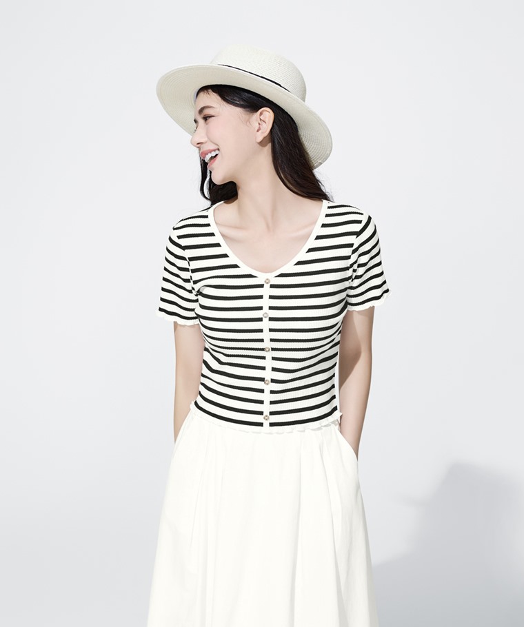 羅紋條紋V領鈕釦T恤-女(黑白條-S)