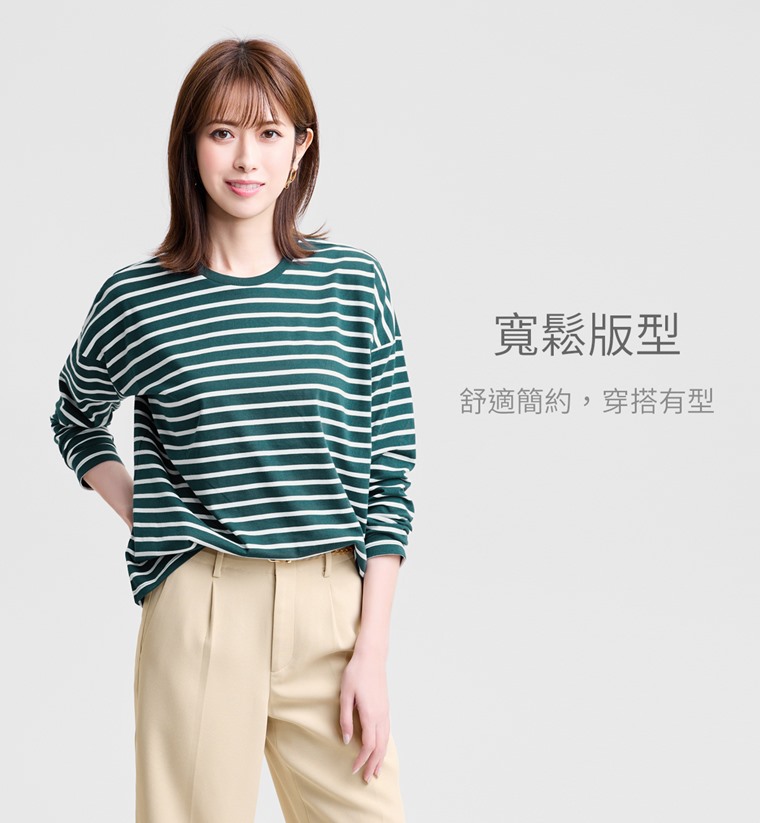 柔滑棉寬鬆條紋長袖T恤-女(深綠條-S)