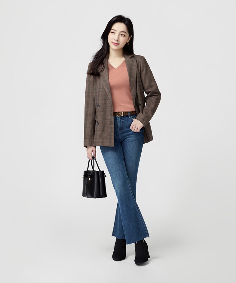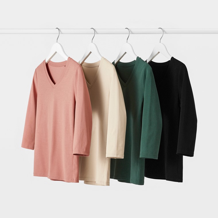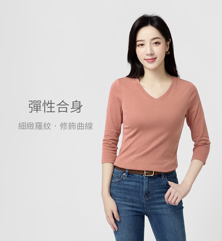 棉質羅紋V領七分袖T恤-女(淺卡其-L)