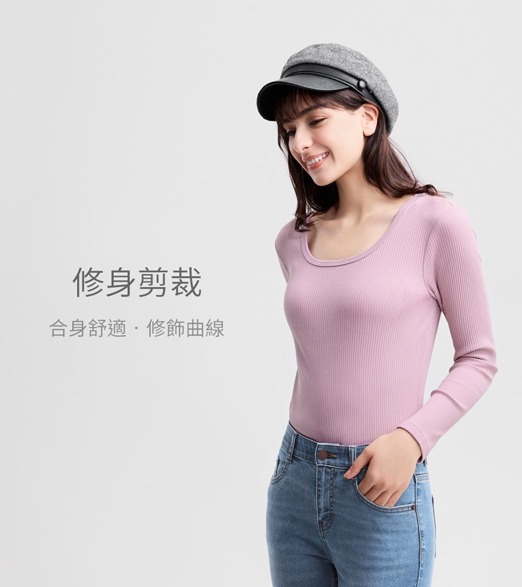 羅紋U領長袖T恤-女(黑色-M)