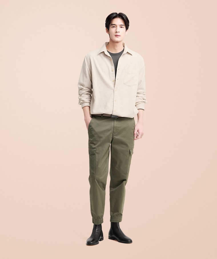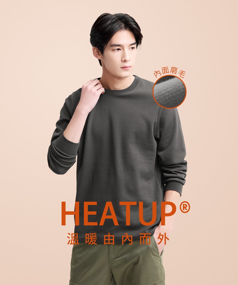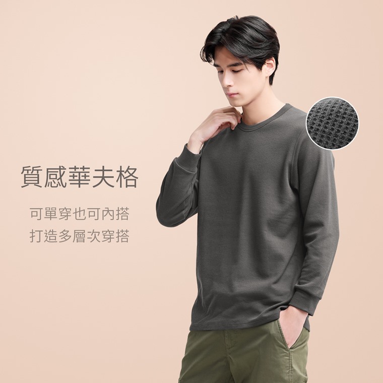 heatup輕磨毛華夫格圓領九分袖上衣-男(米白-S)