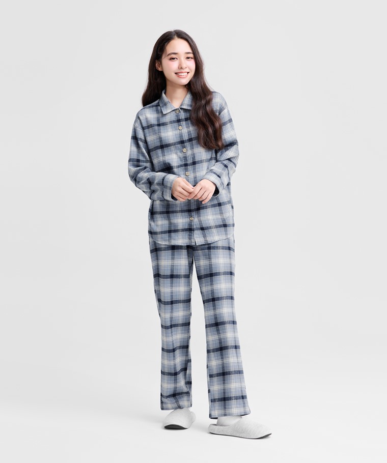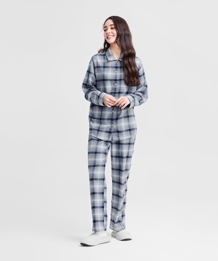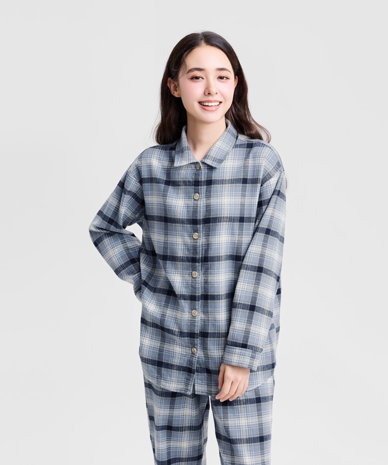 法蘭絨格紋家居套裝-女(粉藍格-S)