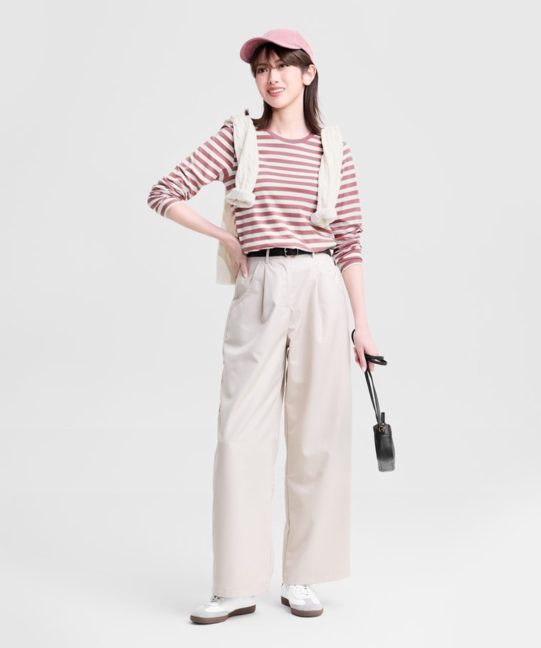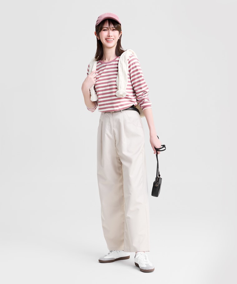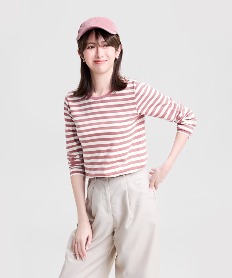 純棉條紋長袖T恤-女(淺灰藍條-S)