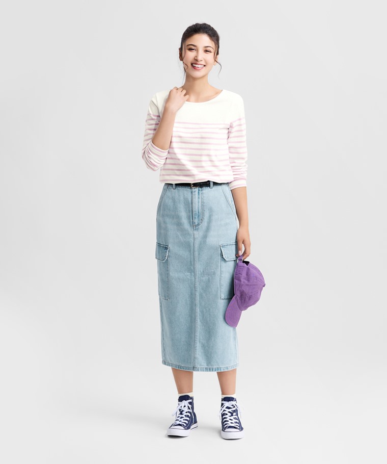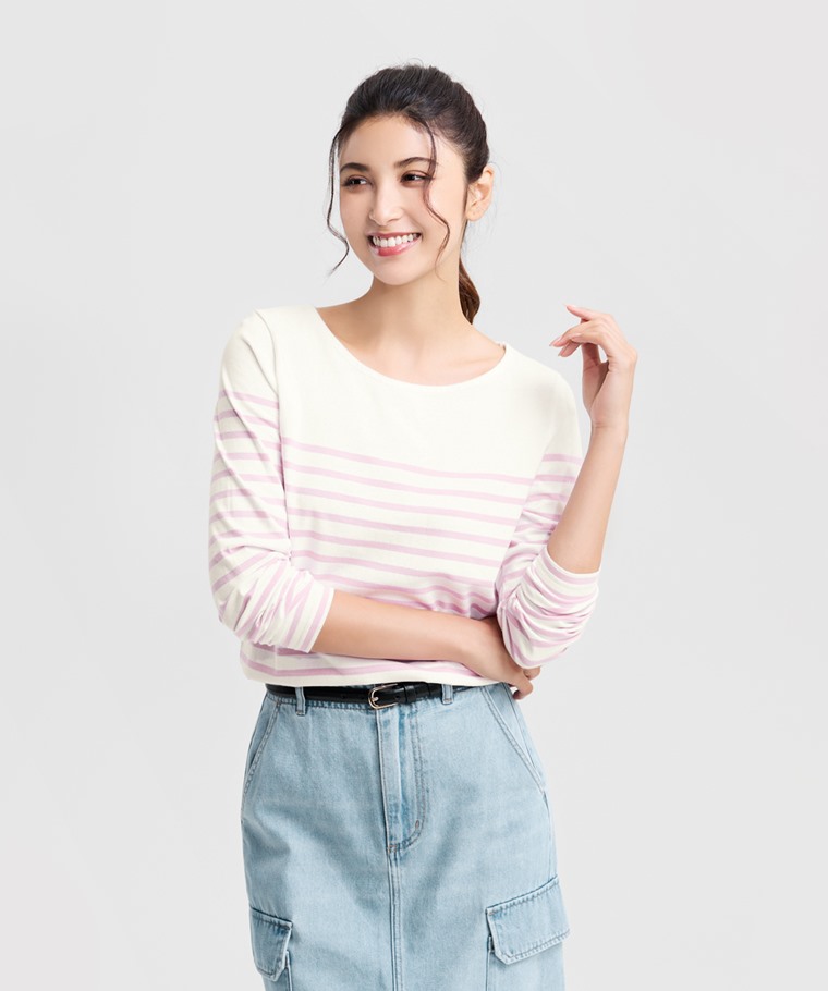 純棉條紋寬領長袖T恤-女(灰卡其條-XL)