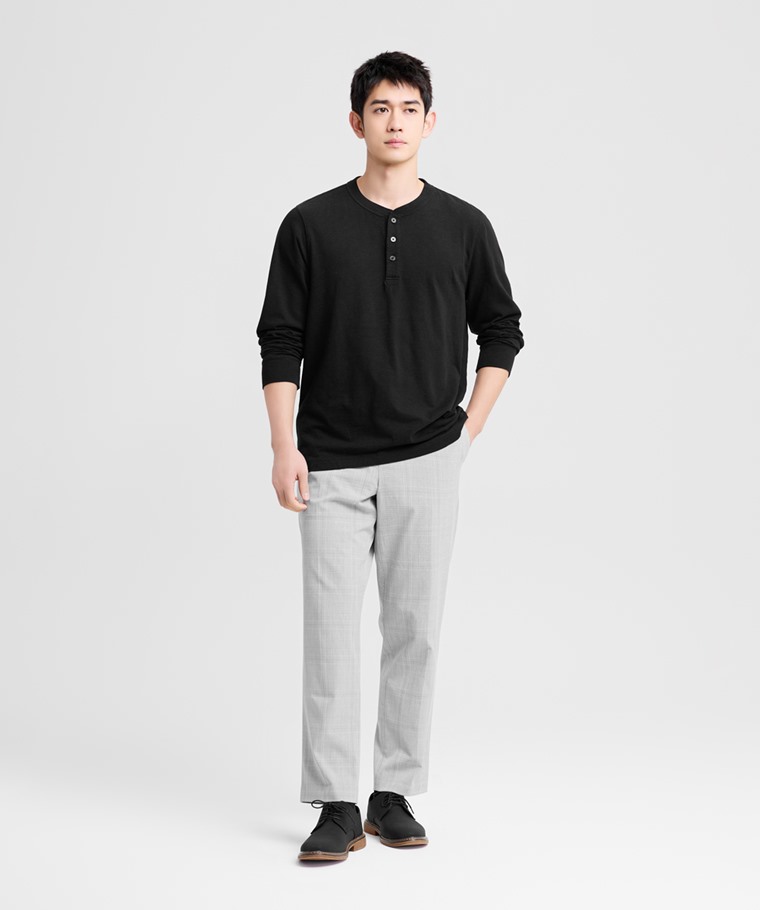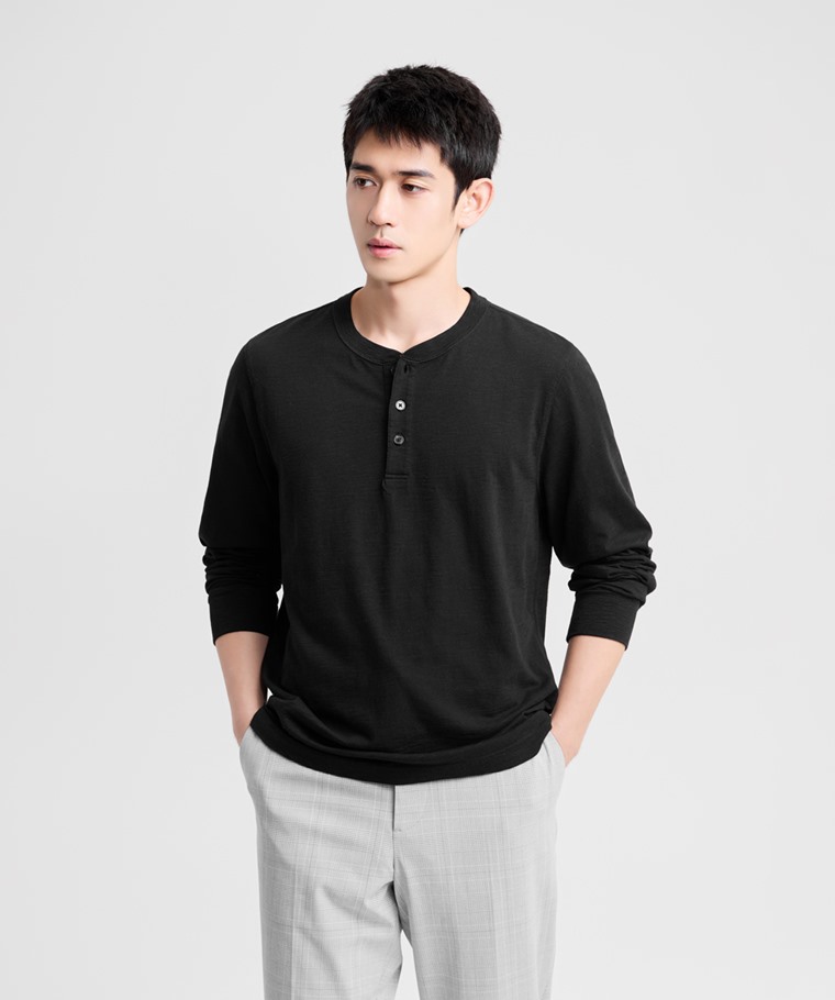 竹節棉亨利領長袖T恤-男(黑色-S)
