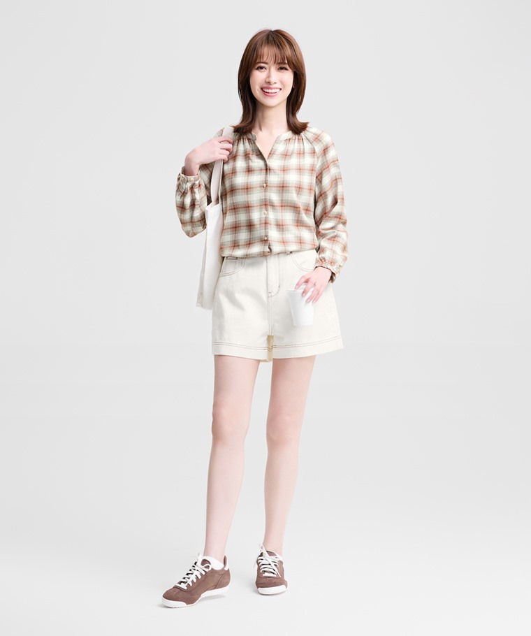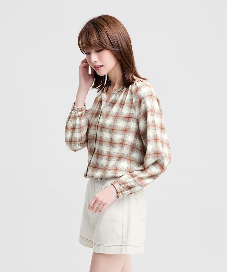 柔軟法蘭絨抓皺格紋上衣-女(米白藍格-S)