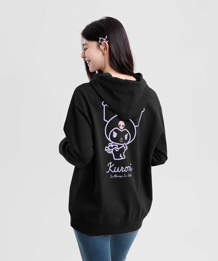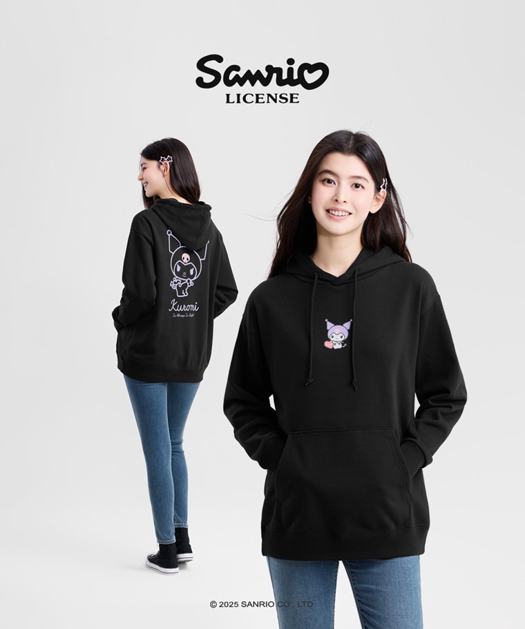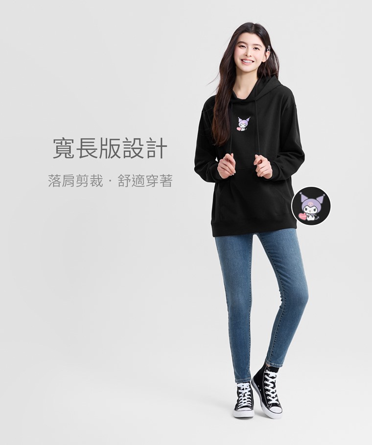 三麗鷗毛圈寬長版印花連帽衫-03-女(黑色-S)