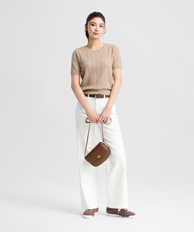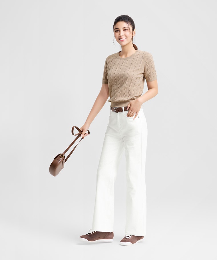 麻花圓領短袖針織毛衣-女(米白-XL)