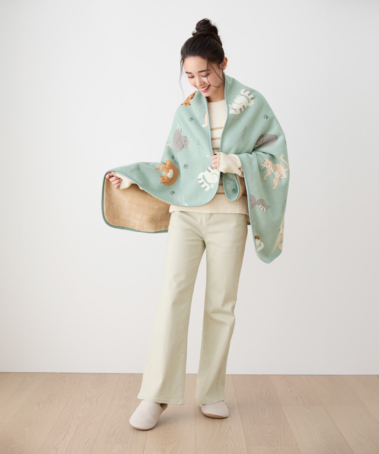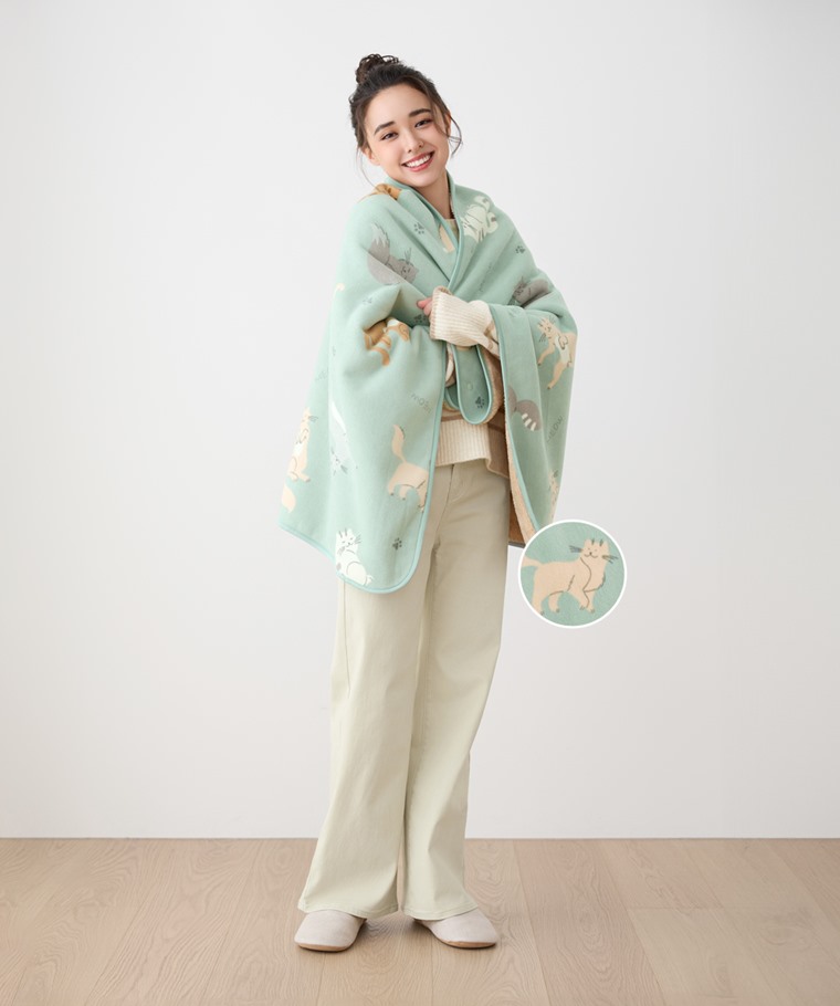 Fleece貓咪印花家居毯-中性款(淡綠-134x80cm)