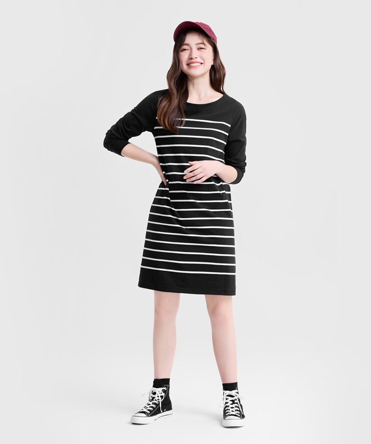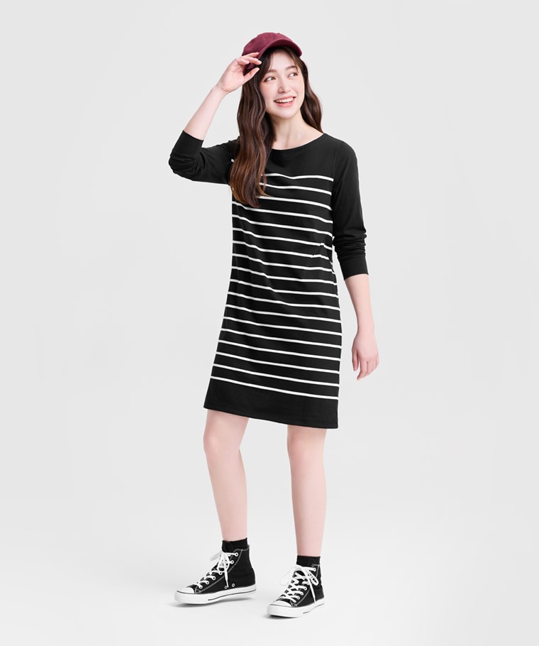 柔滑棉條紋長袖洋裝-女(黑色條-S)