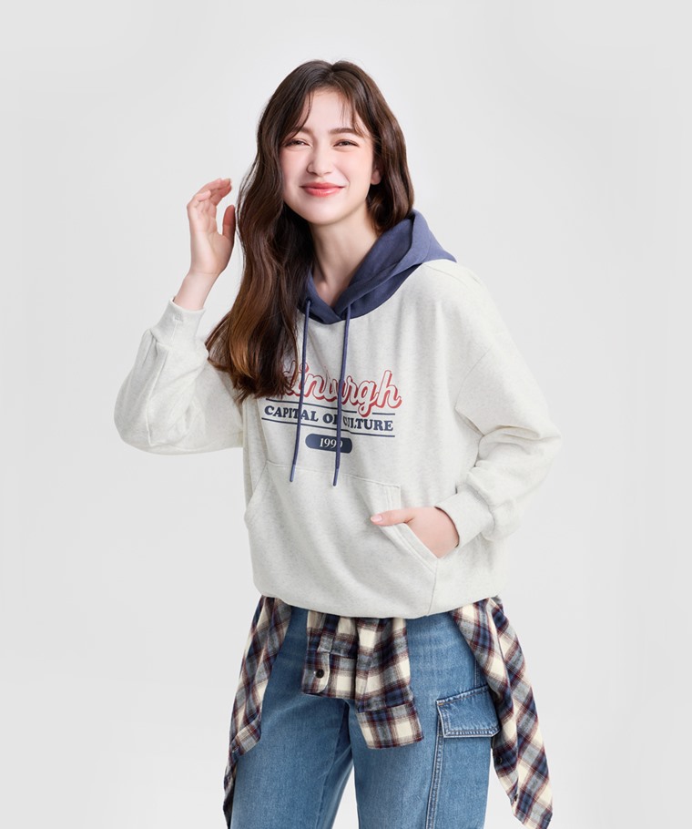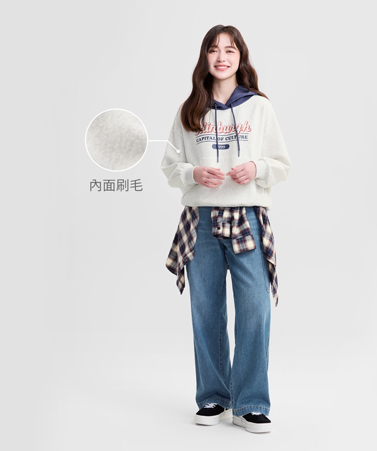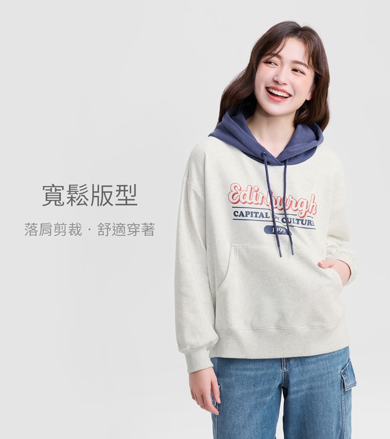 刷毛寬鬆文字連帽衫-女(白麻灰-S)