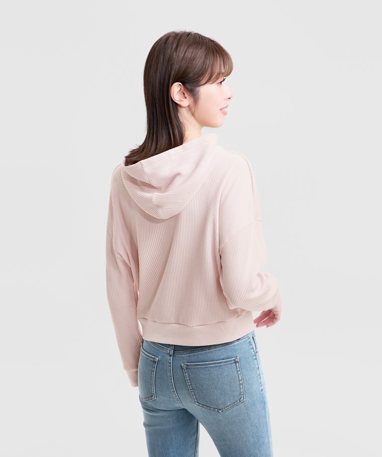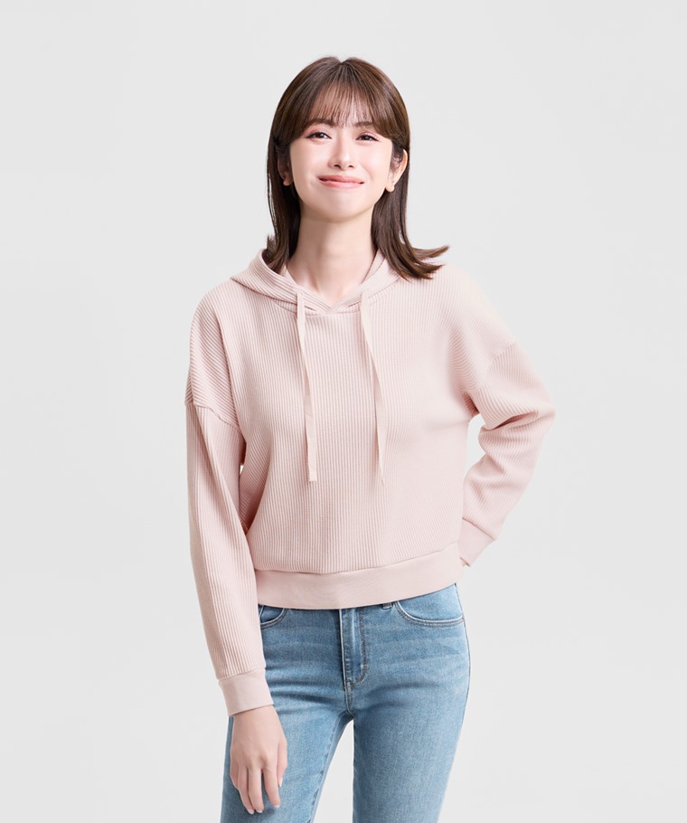 華夫格寬短版連帽上衣-女(麻花米-XL)