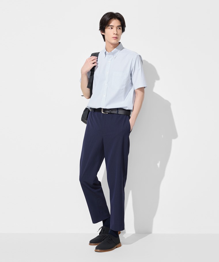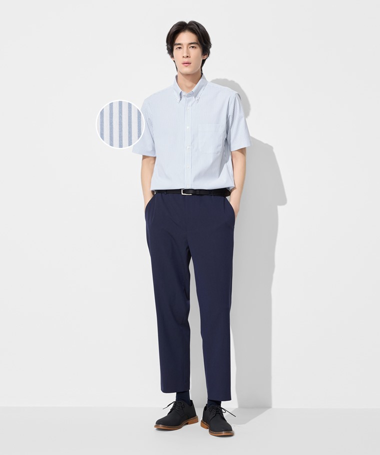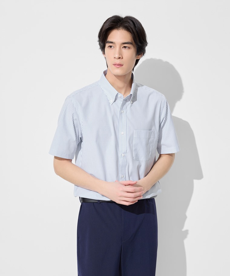 商務彈性條紋短袖襯衫-男(深藍白條-S)