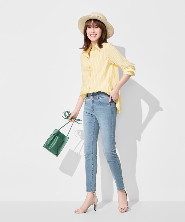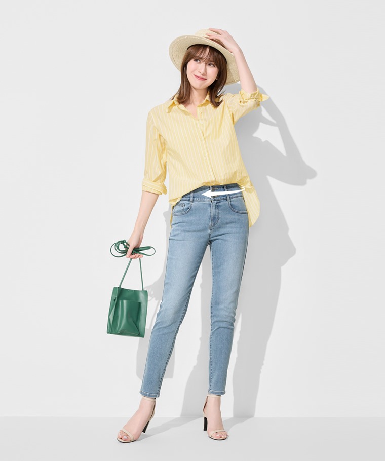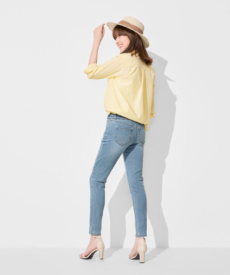 排釦收腹緊身牛仔褲-女(淺藍-L)