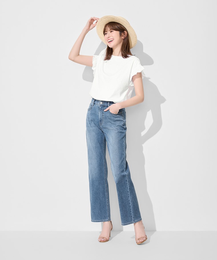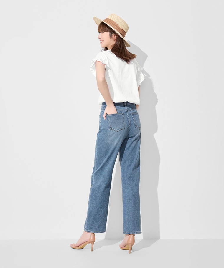 高腰直筒落地牛仔褲-女(淺藍-S)