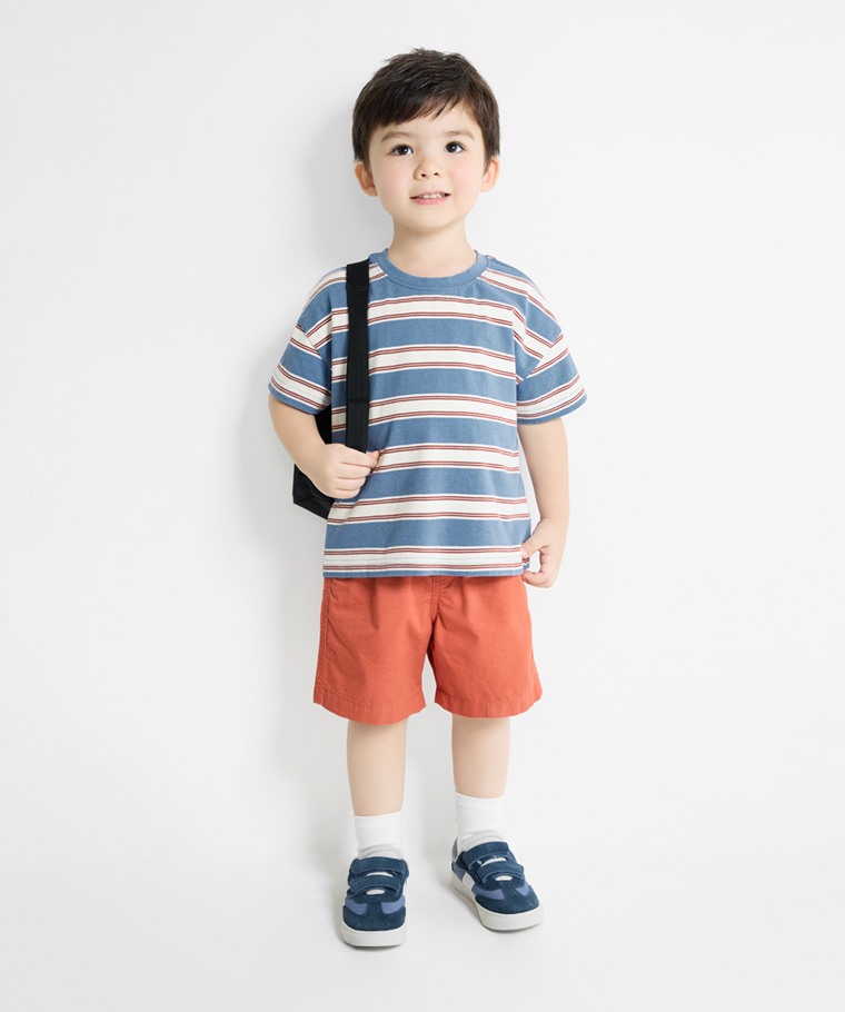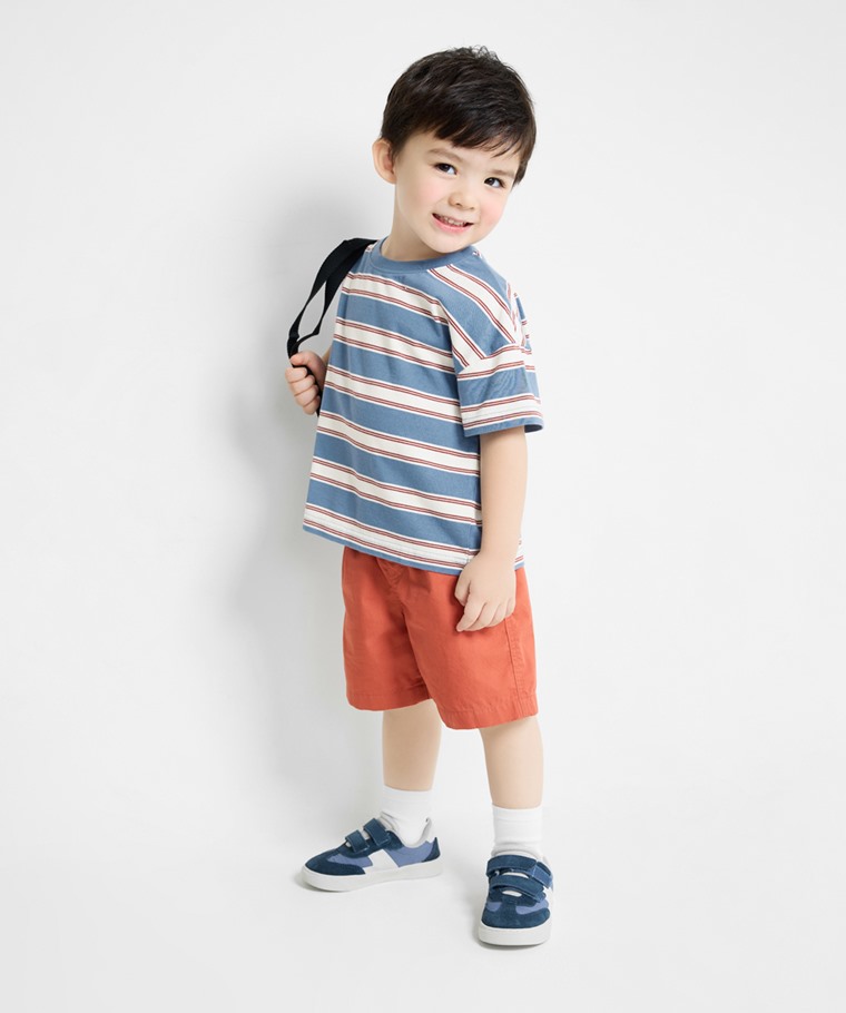 純棉條紋寬版落肩T恤-童(深藍條-130)