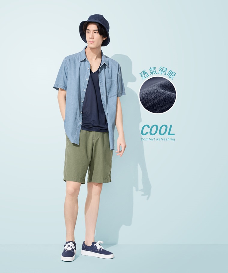 輕涼網眼V領短袖T恤-男(白色-S)