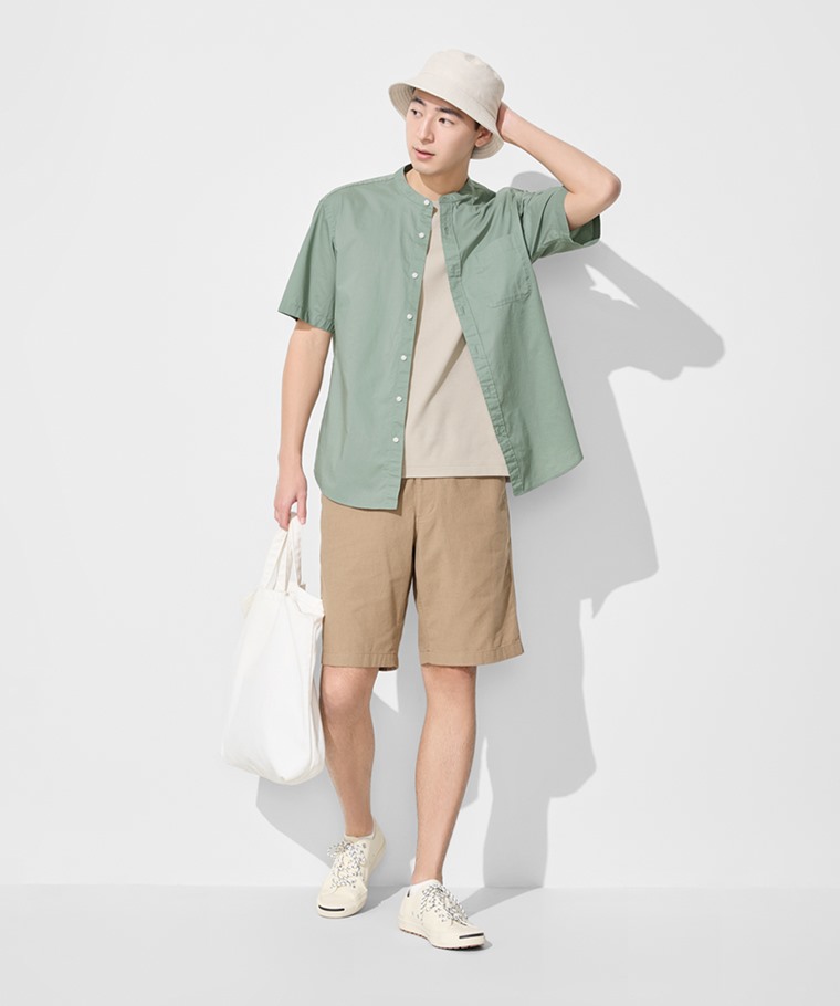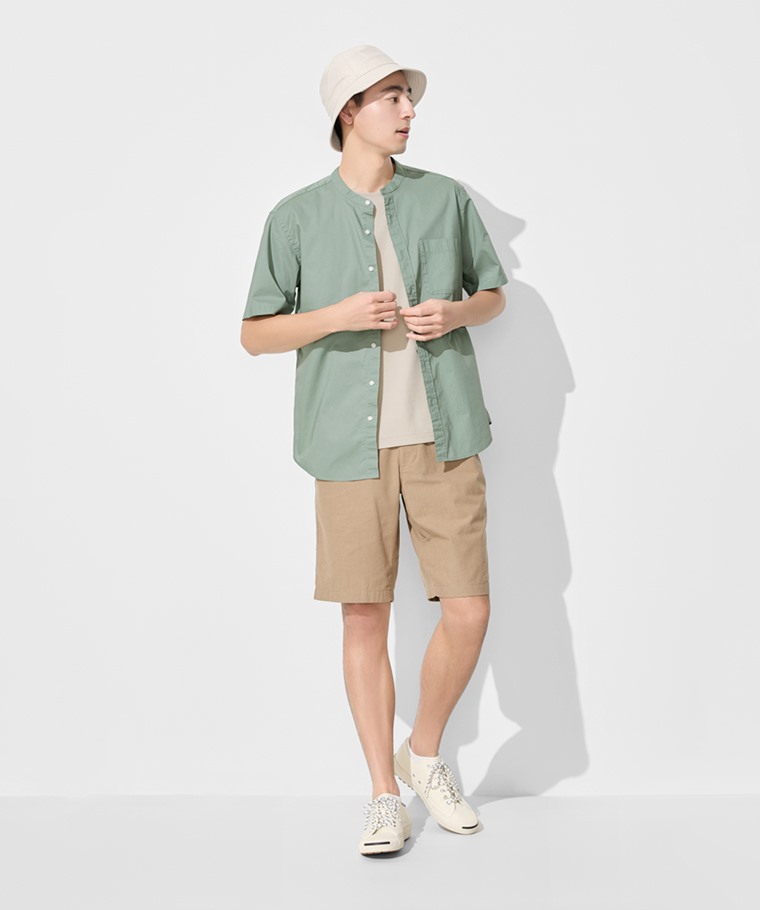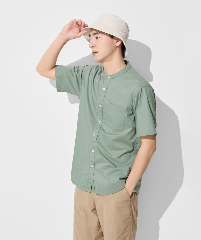 柔棉立領短袖襯衫-男(深藍綠-S)