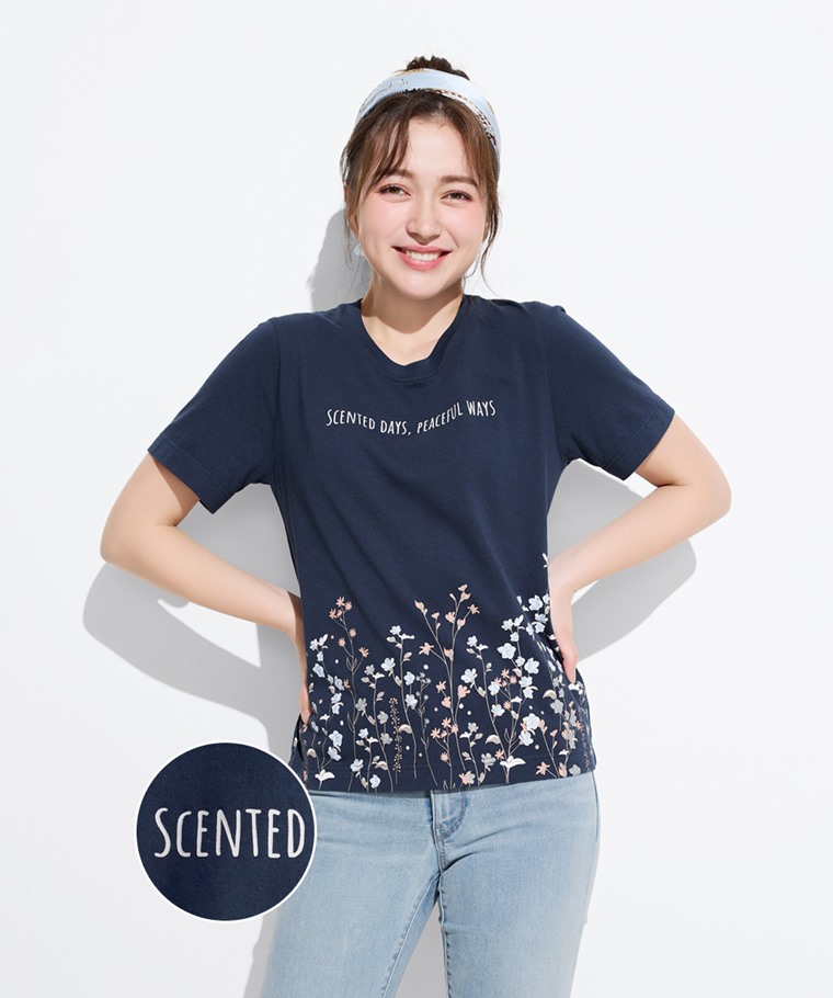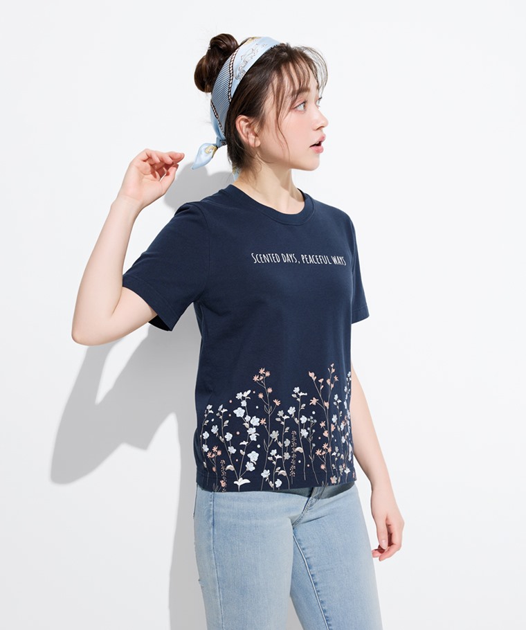 文字花卉厚版印花T恤-女(藏青-S)